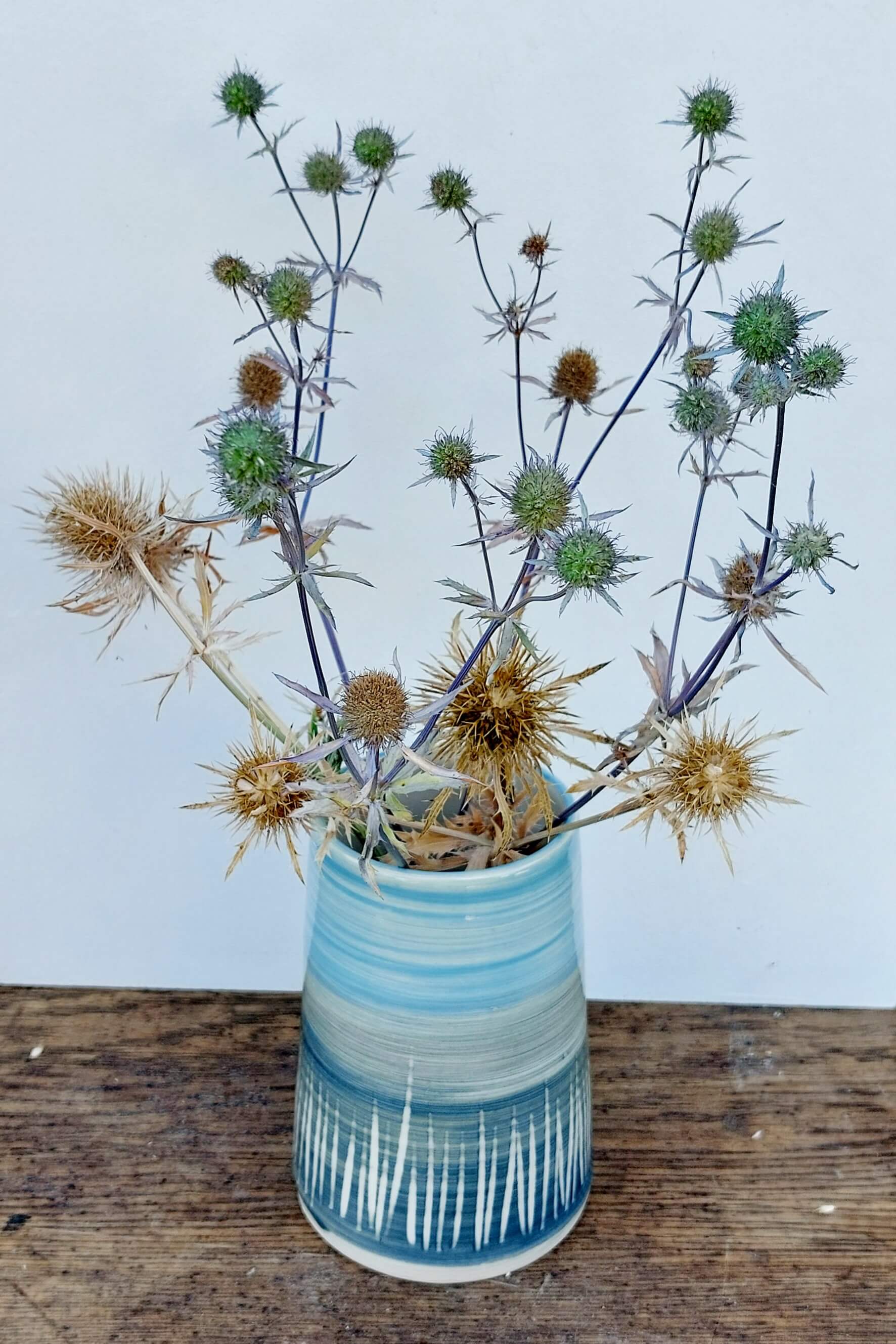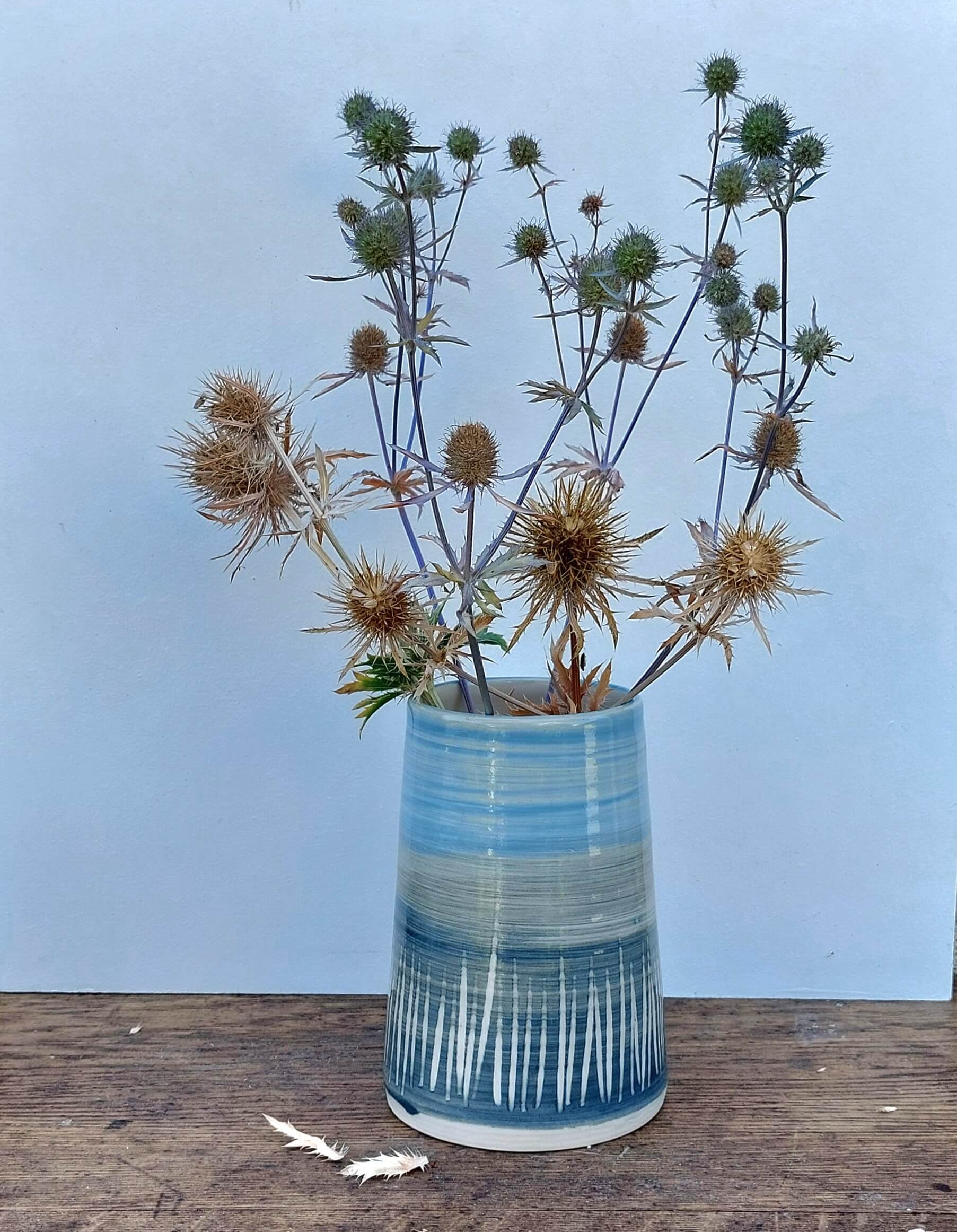 Hand thrown vase decorated with sgraffito grass design in coloured slip, under a clear stoneware glaze.