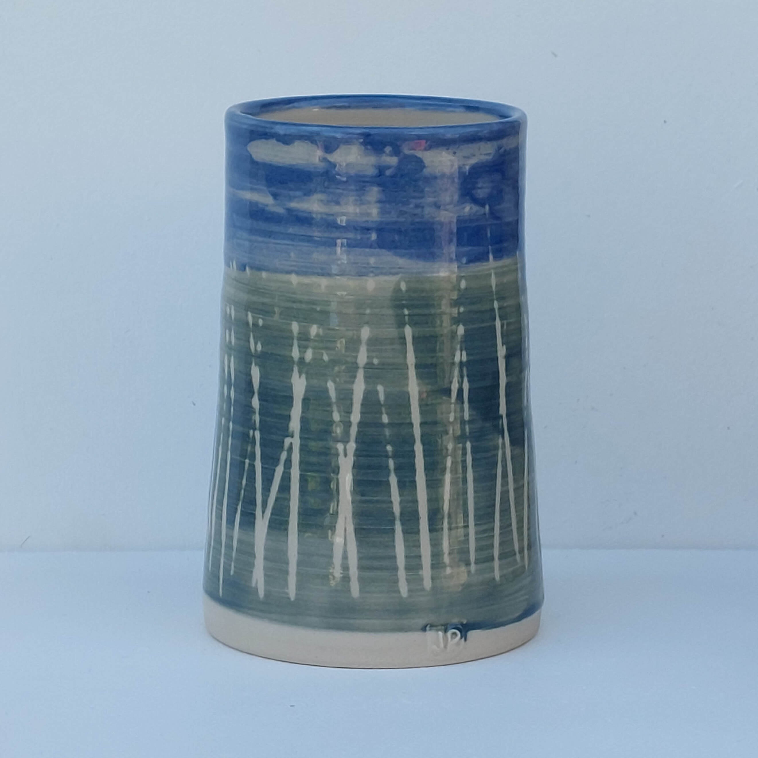 Hand thrown vase decorated with sgraffito grass design in coloured slip, under a clear stoneware glaze.