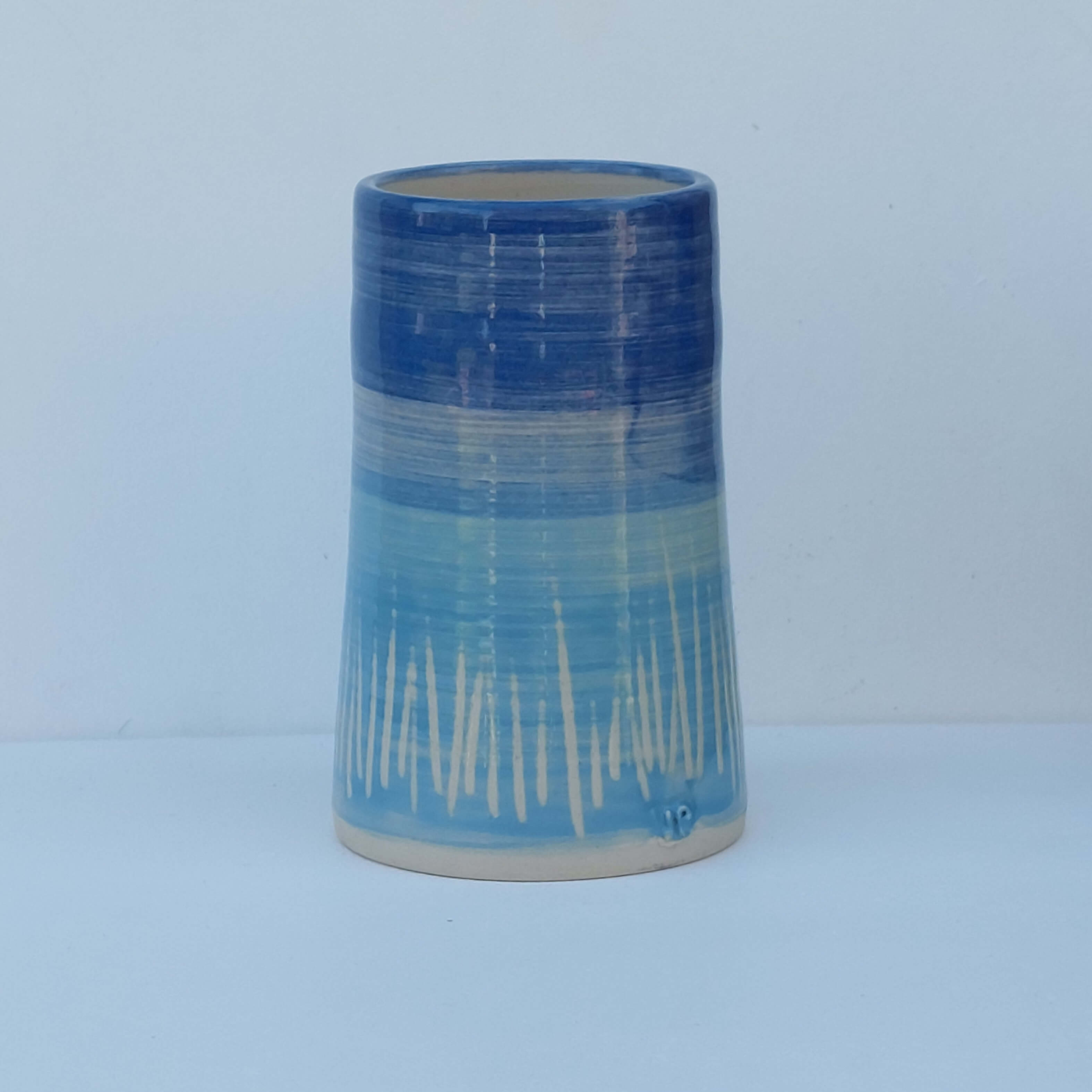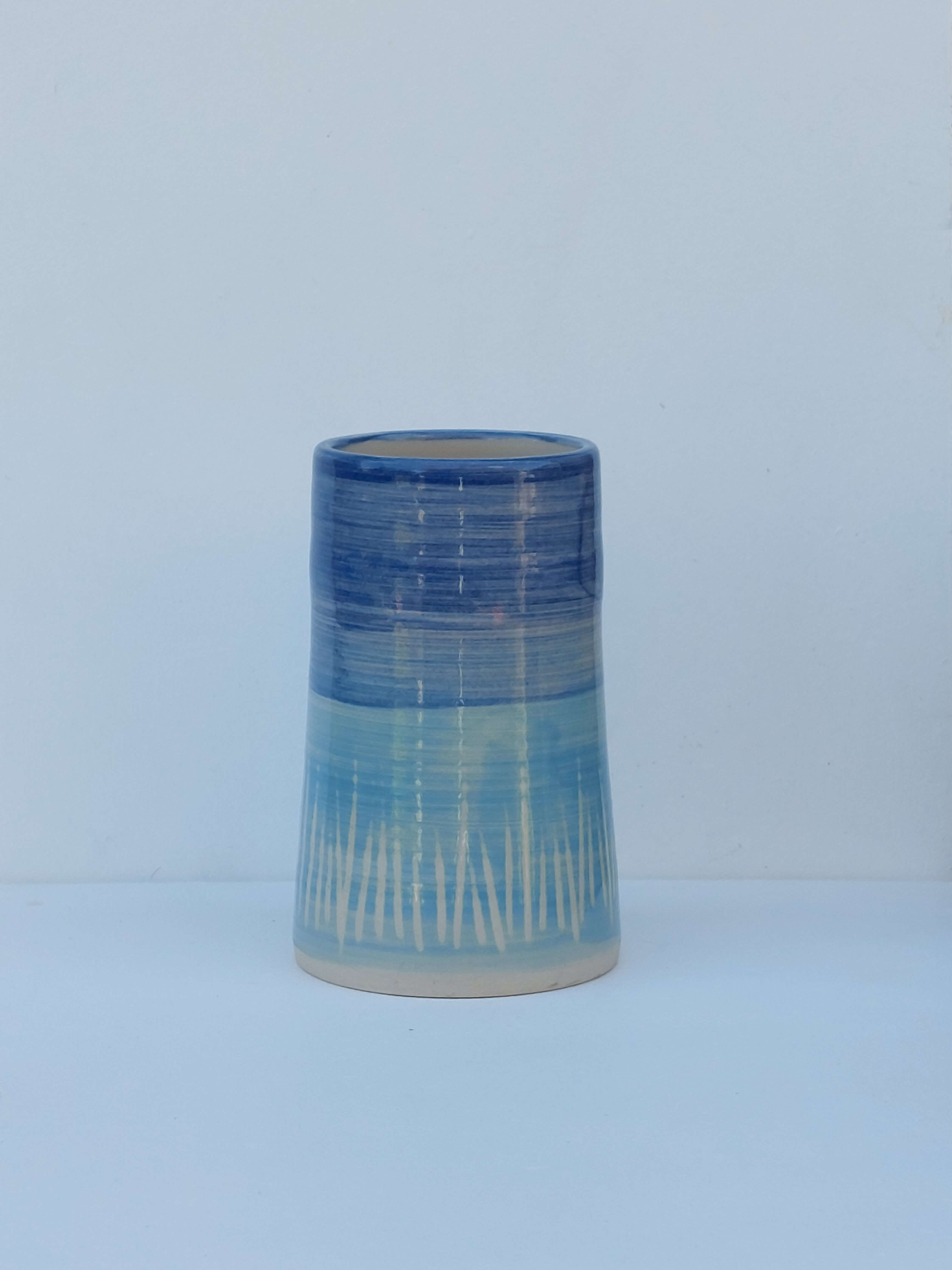 Hand thrown vase decorated with sgraffito grass design in coloured slip, under a clear stoneware glaze.